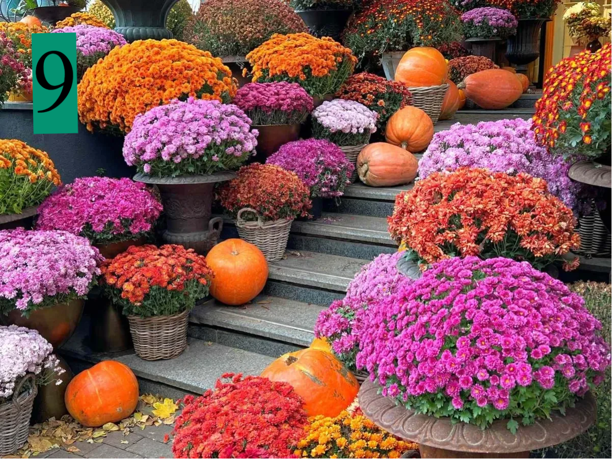 9. pot chrysanten, oranje/steenrood, paars, geel, wit - 7 Euro