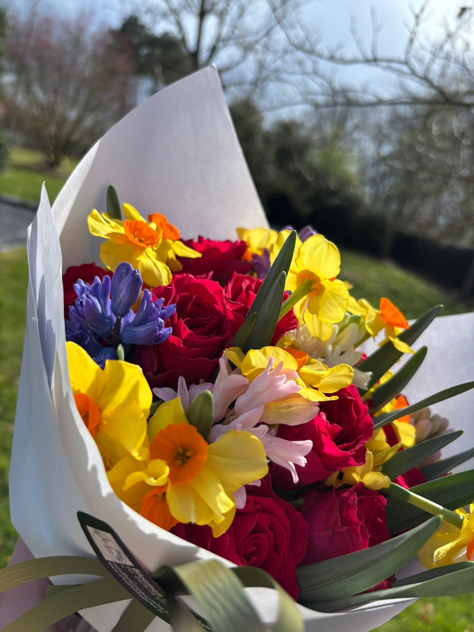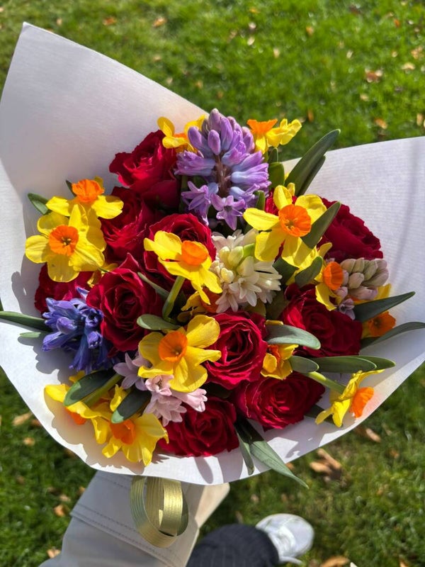 Breng de lente in huis. Dit vrolijk, kleurrijk en heerlijk geurend lenteboeket kan je alle week-ends in april bestellen. Af te halen in het Ateljee op zaterdag. Een boeket met dagverse lentebloemekes - hyacinthen, narcissen, tulpen,....een bonte mengeling van frisse lentebloeiers.