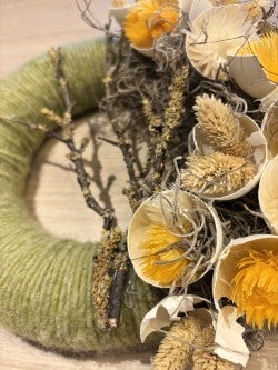 Hoepel met droogbloemen - een hoepel met diameter 30cm, natuurlijke uitstraling. We gaan aan de slag met een kleurenpallet van zachte natuurlijke kleuren en er is een aanbod van verschillende bloemen, grassen, pluimen, mossen en dergelijke...zodat iedere deelnemer met zijn eigen unieke creatie volgens eigen smaak en stijl naar huis gaat.
